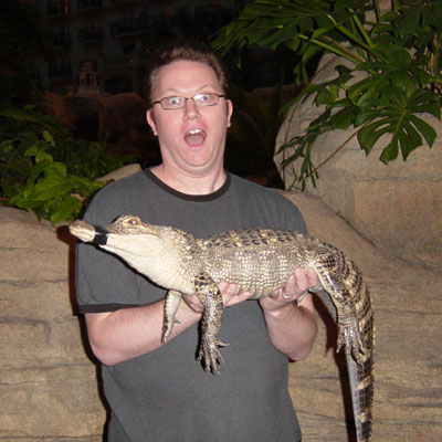 Another photo of my reptilian friend from the Gaylord Palms resort. This one is probably more reflective of the relationship of alligator and man ... i look scared s@$tless and he looks devilishly content.