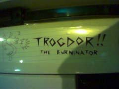 Then on our way home, i noticed a car with a Trogdor bumper sticker. I must admit that two months ago i would've had no idea what the hell this was referring to, but thanks to Rob and Bill i am now conversant with Homestar Runner, Strong Bad, et al. "Draw an S, next draw a more different S ... use consummate V's ... burninating the countryside!"