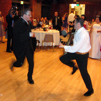 Despite last minute panics, the event came off wonderfully. The girls all looked fabulous, but Veronica rightfully stole the show with her awesome hair. makeup, and dress. What every groom hopes to see approaching him down the aisle. Michael put together a brief ceremony that came together nicely. I achieved my goal of making Veronica tear up during my vows. We then took some photos with our great photographer Dave before being announced by Greg and having our first dance, to "Breathless" by Adorable (a great pick by Veronica). Dinner by Shai's catering was scrumptious, and then we danced away. The highlight was Michael and i clearing the dance floor to skank to "Little Bitch" by The Specials. Unfortunately everyone then told me that Michael put me to shame, and it's evident in this photo: his knees are twice as high as mine! I can't defend myself, i was dying 3/4 of the way through the song.