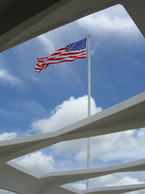 The U.S. flag waving over the monument and the remains of the U.S.S. Arizona