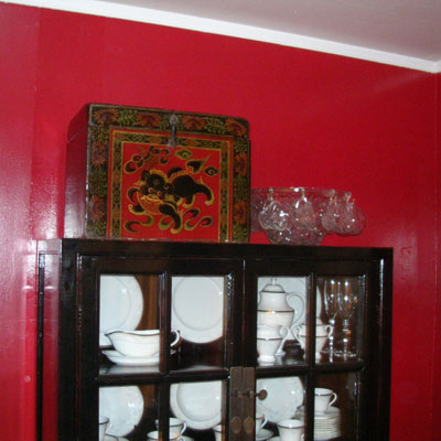 V came up with the cheeky but undeniably appropriate idea to put a flashing neon sign reading "Asian corner" above this end of our dining room to denote its decorative inspiration. She's worried about it becoming too specific of a look, but i kinda like the imperial Chinese china cabinet and the old painted wooden box. Also note, that will not be the final resting place of the punch bowl.