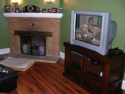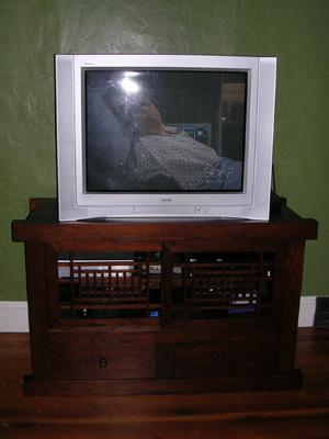 Our shiny new Room and Board entertainment center arrived yesterday morning. The delivery men carried it in and put it in its final resting place, and were even so kind as to put felt liners on our incredibly heavy TV's legs and move it onto the new piece. All this while Tara was harassing them incessantly. The new "media center", as Room and Board puts it, raises the TV a good foot and a half or so, and i think frames it better than the old stand and makes it seem bigger. The DirecTV, DVD player, and game consoles all fit nicely in the central area, and there are two drawers in which i've hidden the mess of game controllers and cables as well as a few game boxes and DVDs. Here you see a shot of the unit as Veronica puts it through its paces. Poor Dr. Greg Madden.
