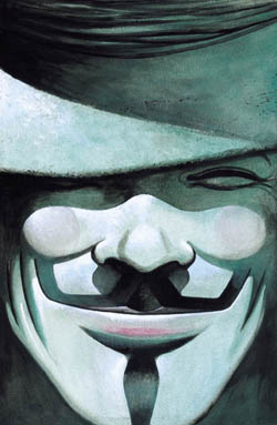 I finished reading the superb graphic novel V for Vendetta last night. I can sit and nitpick, but overall i have to say i was quite taken with Alan Moore and David Lloyd's vision of the future as well as their creation of an enigmatic protagonist who we never fully understand. For starters, the idea to have the hero dressed in Guy Fawkes mask and garb is brilliant. Obviously it asserts his role as a revolutionary, but it also creates the perfect sense of mystery and uncertainty about the hero, his agenda, and his motives. Some of the ideas in the comic do come off a bit dated 20 years later, such as their attitude toward computer hacking, but the whole reads as a superhero-oriented retelling of 1984, a call to arms to citizens living under authoritarian rule and a warning to societies flirting with assigning their governments too much power. The action and suspense elements of the story don't really take your breath away, but the tone and message of the work are rock solid and are delivered with enough panache and visual mastery to keep you enthralled.