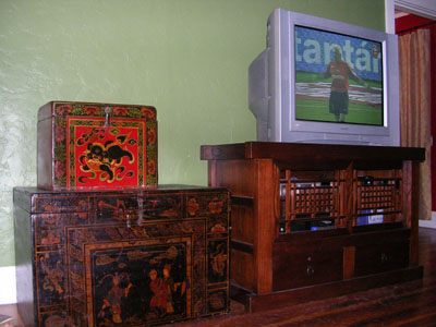 Our living room is approaching completion. The Asian corner in our dining room has been supplanted by the Asian wall shown here. Shown on the screen is either Spanish, Italian, or German football, i can't remember which.