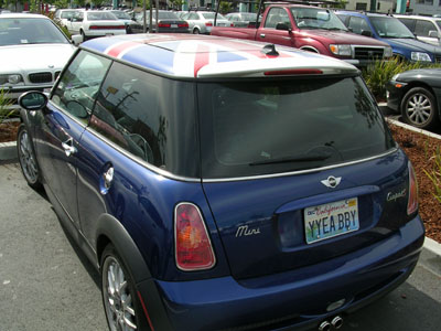 On Saturday i headed up to the city with Veronica to give her hand at work. Afterwards we headed over to Best Buy so i could pick up a 1GB USB jump drive (rapidly becoming a necessity for me at work). Although we left empty handed as i knew i could find them online for less than the $110 Best Buy wanted, we spotted a decidedly British Mini Cooper in the parking lot, complete with personalized license plate. No International Men of Mystery to be seen, though.