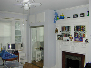 Ted and Veronica's bedroom, with a closeup of the fireplace and mantle.