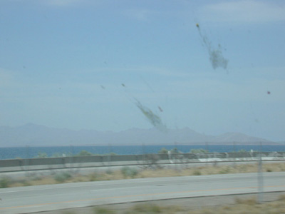A rather uninspiring shot of the Great Salt Lake, Utah. And some dead bugs on our windshield.