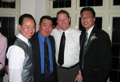 The weekend before last i attended my third wedding of the summer, this one for high school chum Joe and his bride Cindy. I met Joe on the first day of 7th grade when i was late for science class (being the logical person that i am, i assumed that since the day is six periods long, lunch must be after third period). I took the only seat left, and ended up at a lab table with Joe, Justin, and Nishay, three of my best friends throughout high school. Joe got married at the Palmdale Estates in Fremont, where my sister will be wedded next summer. So i was not just a casual observer, i was also doing some reconnaissance for my mother. It was a nice garden service, including a minister who apparently wasn't used to being mic'ed as his whispered instructions to the bridal party could be heard even by those of us in the last row. The reception was a lot of fun as well. The MC altered the typical "clink the glasses to see the bride and groom kiss" so that whenever glasses were clinked, the couple picked another couple from the audience to kiss, and then the newlyweds had to duplicate their actions. That became very interesting. All in all, a final summer chance to see good old friends like Clement, Julie, Joe, Sung, George, Colleen, and Iqbal.
