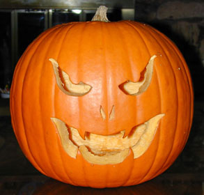 Apparently one of our friendly (or not so friendly) neighborhood squirrels decided that my jack o' lantern wasn't quite finished. One day after we put it on our porch, i come home to find Veronica giggling uncontrollably. The little bastard chewed off my pumpkin's fangs! My evil visage looks like he's lost his dentures. The squirrels are no longer my friends.