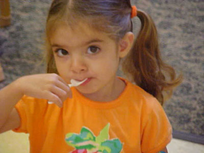 Putting jam on toast under Daddy's watchful eye Posing for photos on the couch The pigtail gang at day-care
