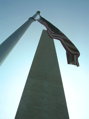 Walking up the hill toward the Washington monument Stars and stripes over the monument The view down from the Washington monument, including the WWII memorial, the reflecting pool, and the Lincoln memorial